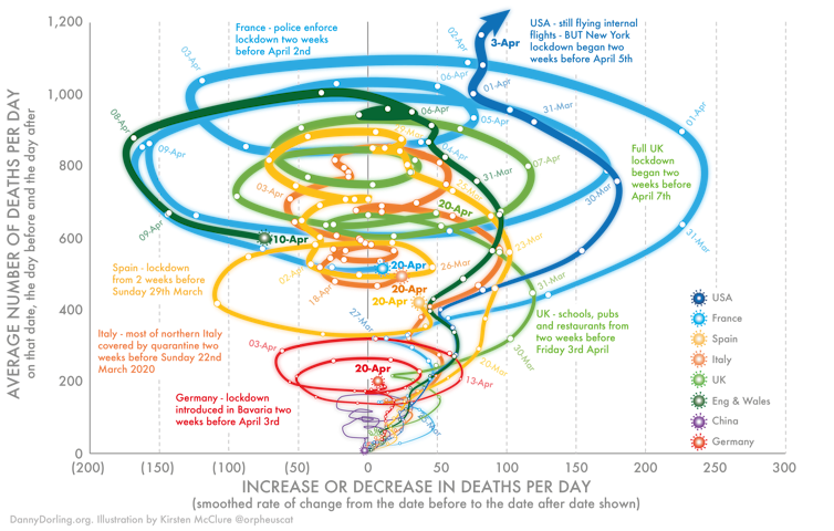 It shows both the smoothed number of deaths each day but now also the rate of change in that number. And it adds data from seven additional country datasets: France, the USA, Spain, Italy, China, Germany and the UK as a whole.