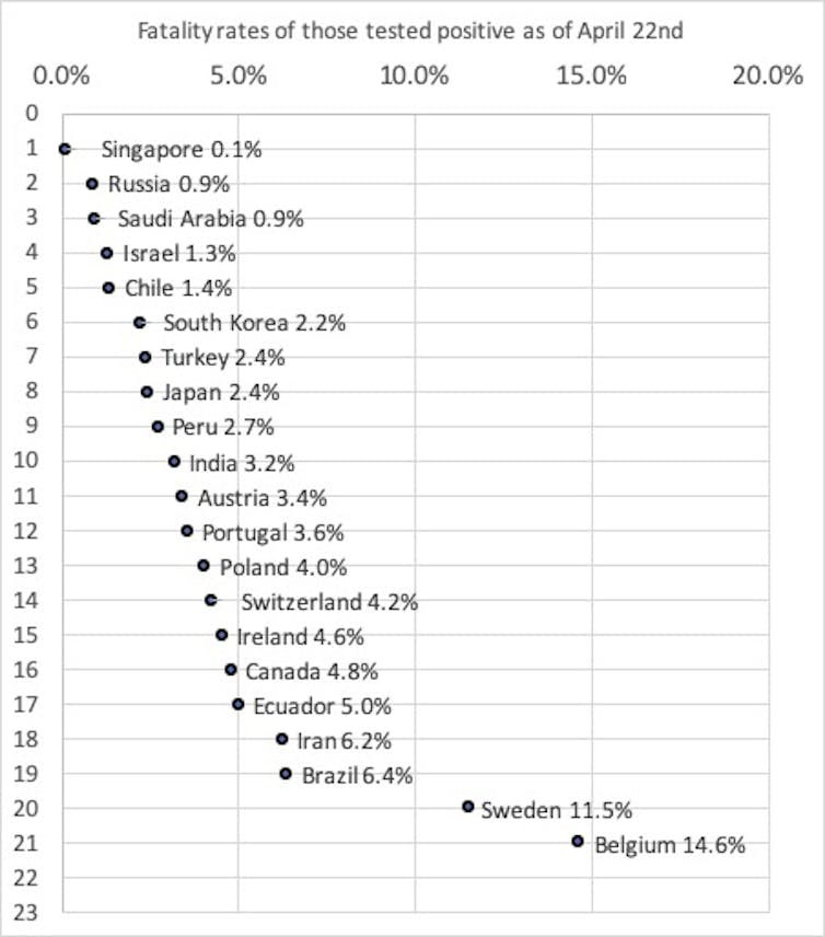 It ranges from Singapore, where only one in 1,000 of all those who have tested positive have died, to Belgium, where 15% or almost one in seven have died. In Belgium, it is almost exclusively people who are very ill who are tested and so the mortality rate appears to be 150 times higher than in Singapore where a much wider range of the public has been tested.